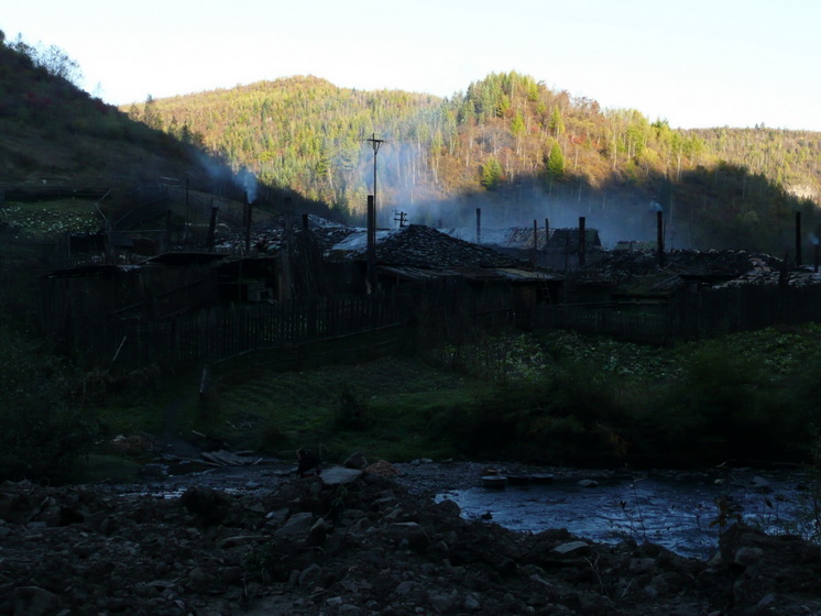 屋顶上没有瓦,铺的是石片。看到有人照相,对岸的孩子往这边扔石头