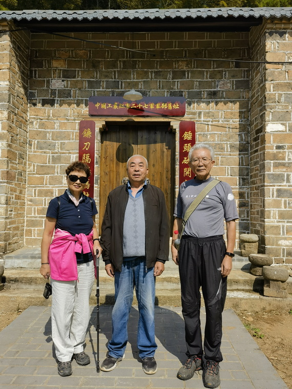 我们沿山寨石英石的石板路,(以前是天堑,没有道路)艰难的爬了700多米,进入攀龙门——寨子大门,到达寨子顶部的红27军军部旧址和佛教寺庙,遇到了看守军部和寺庙的老人。老人的父亲毕业于黄埔军校毕业,曾是27军的军官。我们与他攀谈并合影留念。