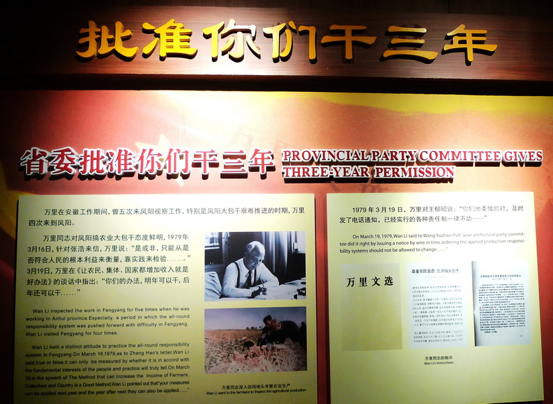 我们从纪念馆收集的当年报刊和中央文件中,了解了当时从中央到地方在改革进程中的激烈斗争。万里在安徽工作期间,曾五次到凤阳视察,特别是凤阳大包干推进艰难的时候,他说:“是或非,只能从是否符合人民的根本利益来衡量,靠实践来检验。”我们虽然都是经历八十年代改革过程的过来人,但是今天重温小岗村的改革经历,亲临十八户农民在黑暗的小屋中按下血印的桌前,还是深感国家改革的艰难不易和建国以来中国走过了太多弯路。