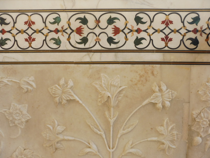 走向白色大理石陵墓,我们可以清晰地看到墙壁上镶满各种颜色的宝石,构成美丽的花纹图案。我们穿上鞋套,排队进入主穹顶陵墓,看到沙贾汉与马哈尔的两座石棺。在白色主体建筑的两旁,还有两座用红砂石建成、顶部为白色的清真寺,其目的是体现整座泰姬陵建筑的对称之美与和谐效果。