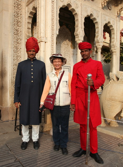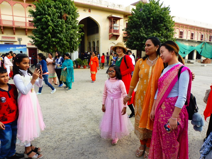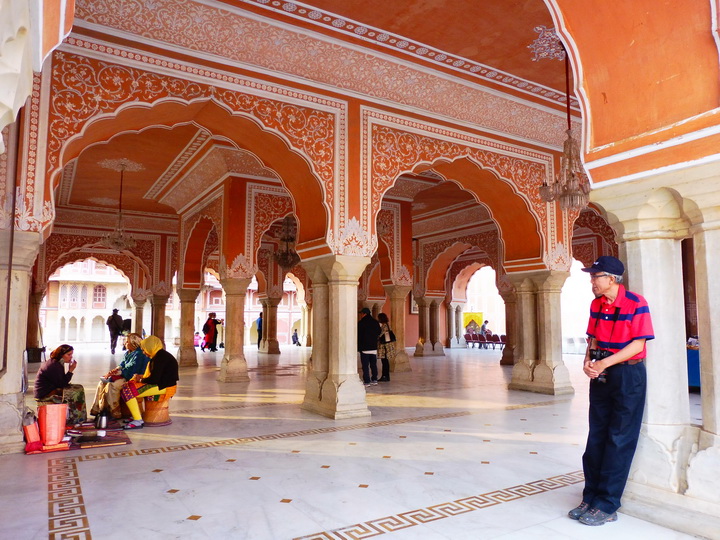 在斋普尔,我们还参观了城市宫殿。城市宫殿是斋普尔统治者在琥珀宫之后在城市中心又修建的王宫。王宫的建筑融合了拉贾斯坦和莫卧尔的建筑风格。在王宫里,我们参观了迎宾大殿、服饰博物馆(王室成员曾经的服饰)、武器馆(印度皇家军队曾经用过的各种武器)、王室成员的迎宾和起居的地方、宫廷内部庭院和王室后裔的居所——月神殿。武器馆内各类兵器的展示相当全面、精致和先进。斋普尔的风宫专为宫殿女士们为欣赏街景而又不被外人所见的便利而建的,水宫则是王室成员的夏宫。我们仅在外拍照留影。