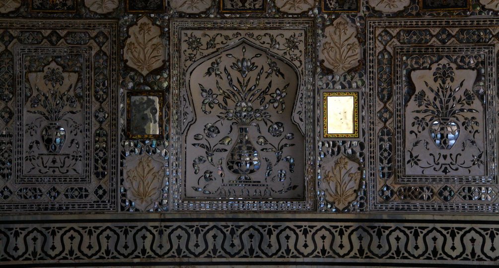 琥珀宫内最著名的是镜宫。镜宫内的三座寝宫,墙壁上皆为水银镜片镶嵌的艺术图案。白天阳光照射,熠熠生辉。夜间点上蜡烛,光点闪烁,在苍穹的宫顶下,如同繁星点点。一位英俊的印度警卫主动为我们领路,告诉我们最佳的观望和拍摄地点(当然免不了索要小费)。