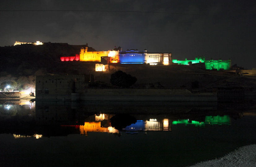 夕阳西下时,我们乘人力车专程又到琥珀宫,站在宫外的河对面,遥望被五彩灯光照亮的琥珀堡灯光秀夜景。色彩缤纷的城堡给人们呈现了斋普尔昔日的辉煌和神秘。遗憾的是,我们未能亲临灯光秀现场感受。