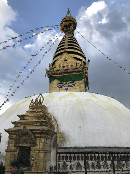 被列为世界文化遗产的斯瓦扬布纳特寺,建于公元前3世纪,有2500多年的历史,是尼泊尔最古老的佛教寺庙。释迦摩尼曾亲临此地,后来成为佛教中心。由于寺庙区内有几百只由僧侣喂养的猴子,常被中国人称为“猴庙”。白色的佛塔建在山上,周围是喇嘛的寺庙。塔身为圆锥形的斯瓦扬布纳特白塔,主建筑是一座镶着铜片和金箔的巨型舍利塔。看了当地的有关资料,我了解到,斯瓦扬布纳特塔是空气、热能(太阳)、土地和水的综合象征。塔身包括的四个主要部分与佛教的教义密不可分:一是顶端的圆顶为空气元素(air)的象征;二是以三角形塔身体现热能元素(heat),也代表创造生命的子宫,因此在圆顶里面的私密处;三是以四方形镀金塔基显示的坚固土地(earth),代表人们赖以生活、工作和享乐的地方;塔基上四面各绘有一双慧眼,象征着佛陀的无上智慧和无所不见。慧眼之下的尼泊尔数字“1”,代表佛的鼻子,象征大千世界的和谐统一;四是以层层递减螺旋圆形塔头,体现水的元素(water),13层铜镀金圆盘阶梯象征着菩萨从因至果的十三行位,每一圈代表人们要遵守的规矩,以悟道佛的精髓。塔身的四面各有四座分别代表土地、水、火和空气的女神像。据资料介绍,正是这四种元素的特征,导致世间事物的不断变化,使人们通过眼睛看到物质形状(shape)的变化、通过耳朵听到物体发出的不同声音(sound)、通过鼻子闻到东西的不同味道(smell)、通过嘴巴感觉到食物的酸甜(sweet and sour)、通过身体的接触感应物质的存在。塔的四周悬绕数十挂铜质华幔和铜钟,象征涅槃圣果。顶端数十米铜质鎏金宝顶塔刹上,有显示密宗权利符号的青铜金刚杵。不论是从宗教艺术或是从建筑艺术角度,斯瓦扬布纳特寺都是尼泊尔佛教金塔的经典建筑。2015年尼泊尔的大地震损坏了佛塔周围的寺庙建筑,加之时间久远,整个寺庙看上去比较破旧,但其精致的建筑和设计元素的寓意,使其神圣永在。