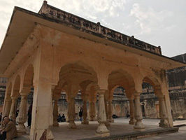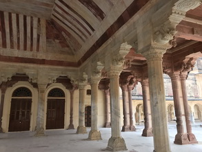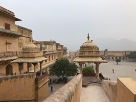 始建于1592年的琥珀宫,从宫外看,城墙围宫,蜿蜒几公里,十分壮观。我们分乘几辆吉普车爬上城堡宫的山(很多游客则是乘坐大象上去的)。整个城堡宫殿非常之大,如同迷宫。宽阔的广场用于检阅和训练部队。除了国王处理公务和居住的宫殿外,还建有军械库、仓储库和寺庙等。此外,还有专门为国王的12个妻子建造的大庭院和后宫。后宫的设计使得宫殿主人可以在任何其他妻妾都都不知觉的情况下随时进入。