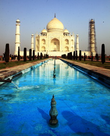 站在白色陵墓主体前的中央喷泉水池前,半圆形圆顶和八角形建筑主体的泰姬陵倒映在蓝色水池中清澈的水面上,美轮美奂,无人不为其典雅、浪漫、和谐和清新之美而感染。