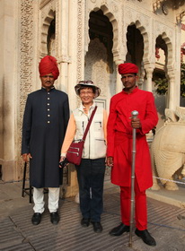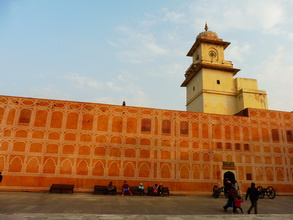 在斋普尔,我们还参观了城市宫殿。城市宫殿是斋普尔统治者在琥珀宫之后在城市中心又修建的王宫。王宫的建筑融合了拉贾斯坦和莫卧尔的建筑风格。在王宫里,我们参观了迎宾大殿、服饰博物馆(王室成员曾经的服饰)、武器馆(印度皇家军队曾经用过的各种武器)、王室成员的迎宾和起居的地方、宫廷内部庭院和王室后裔的居所——月神殿。武器馆内各类兵器的展示相当全面、精致和先进。斋普尔的风宫专为宫殿女士们为欣赏街景而又不被外人所见的便利而建的,水宫则是王室成员的夏宫。我们仅在外拍照留影。