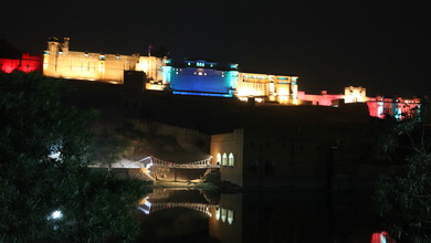 夕阳西下时,我们乘人力车专程又到琥珀宫,站在宫外的河对面,遥望被五彩灯光照亮的琥珀堡灯光秀夜景。色彩缤纷的城堡给人们呈现了斋普尔昔日的辉煌和神秘。遗憾的是,我们未能亲临灯光秀现场感受。