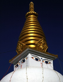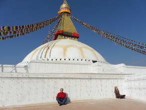 尼泊尔的标志性建筑——博大哈大佛塔(大白塔Stupa),是亚洲最大的圆佛塔,因塔内保留释迦摩尼的舍利和眼睛,被视为藏传佛教圣地,也称“小西藏”。 博大哈大佛塔建于李查维王朝(4~8世纪)期间的6世纪。李查维王朝(公元4世纪~13世纪)是尼泊尔古典文化的第一个黄金时期。白色巨大的穹型圆顶,气势非凡,代表佛教的普世的博大精深(Universe or vase of great treasure)。在白色覆钵体上的方形塔四周,都有巨大的佛眼,表示无所不见,佛海无边。佛眼上是金色的塔尖。塔高38米,基座周长100米。环绕白塔的基座,由108个阿弥陀佛浮雕和147个壁龛构成,每个壁龛中有4~5个传经桶。代表5种基本元素(红为火、蓝为天、白为云、绿为水、黄为土)的五色经幡随风飘扬。据导游介绍,塔身分为五个部分:塔底为土、第二层为水、第三层为火、第四层为风,第五层是天堂。雨伞代表天堂,雨伞下面是莲花,莲花代表热情与纯洁,莲花下面是13层阶梯,代表佛教彻悟的十三个阶段。阶梯下面是两只眼,意为智慧之眼。眼睛西面是鼻子,代表天下大同。鼻子下面则是圆型的墓塔。我们按照佛教习俗,顺时绕塔一圈,然后从塔的背面小门登上塔基平台,仰望慧眼塔顶,俯瞰塔下四周熙攘的人群和具有印度宗教文化特色的商店街。真是人在做,天在看。