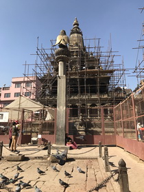遗憾的是,由于2015年8级地震的严重破坏,我们看到很多寺庙都是脚手架矗立,处于修复和建设过程中。然而,我们还有意外的收获。本来导游仅给了我们二十分钟的时间在广场拍照,但是我和赵建平不经意地发现了王宫博物馆,且博物馆的门票是含在我们已买的票价中的。博物馆门卫主动地带我们去找导游,并解释情况。博物馆曾经是王宫的一部分。因此,我们不仅从博物馆无数珍藏的展品上了解印度教和佛教的宗教艺术和文化,欣赏17世纪至19世纪王宫收藏和民间收藏的佛像木雕、铜雕和金雕,而且也部分参观了曾经的王宫。王宫博物馆的规模、收藏的珍品数量,文字的介绍,都令我们惊喜和大开眼界。从大到印度教不同的神、小到印度神和佛不同的手势和姿势的寓意,文字解释都非常详细,是我们看到的最好的博物馆之一。但因时间较紧,我们只能匆匆拍照,不可能细细参观。但40分钟已经让我们大饱眼福了。