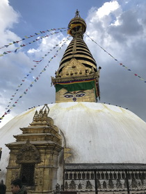 被列为世界文化遗产的斯瓦扬布纳特寺,建于公元前3世纪,有2500多年的历史,是尼泊尔最古老的佛教寺庙。释迦摩尼曾亲临此地,后来成为佛教中心。由于寺庙区内有几百只由僧侣喂养的猴子,常被中国人称为“猴庙”。白色的佛塔建在山上,周围是喇嘛的寺庙。塔身为圆锥形的斯瓦扬布纳特白塔,主建筑是一座镶着铜片和金箔的巨型舍利塔。看了当地的有关资料,我了解到,斯瓦扬布纳特塔是空气、热能(太阳)、土地和水的综合象征。塔身包括的四个主要部分与佛教的教义密不可分:一是顶端的圆顶为空气元素(air)的象征;二是以三角形塔身体现热能元素(heat),也代表创造生命的子宫,因此在圆顶里面的私密处;三是以四方形镀金塔基显示的坚固土地(earth),代表人们赖以生活、工作和享乐的地方;塔基上四面各绘有一双慧眼,象征着佛陀的无上智慧和无所不见。慧眼之下的尼泊尔数字“1”,代表佛的鼻子,象征大千世界的和谐统一;四是以层层递减螺旋圆形塔头,体现水的元素(water),13层铜镀金圆盘阶梯象征着菩萨从因至果的十三行位,每一圈代表人们要遵守的规矩,以悟道佛的精髓。塔身的四面各有四座分别代表土地、水、火和空气的女神像。据资料介绍,正是这四种元素的特征,导致世间事物的不断变化,使人们通过眼睛看到物质形状(shape)的变化、通过耳朵听到物体发出的不同声音(sound)、通过鼻子闻到东西的不同味道(smell)、通过嘴巴感觉到食物的酸甜(sweet and sour)、通过身体的接触感应物质的存在。塔的四周悬绕数十挂铜质华幔和铜钟,象征涅槃圣果。顶端数十米铜质鎏金宝顶塔刹上,有显示密宗权利符号的青铜金刚杵。不论是从宗教艺术或是从建筑艺术角度,斯瓦扬布纳特寺都是尼泊尔佛教金塔的经典建筑。2015年尼泊尔的大地震损坏了佛塔周围的寺庙建筑,加之时间久远,整个寺庙看上去比较破旧,但其精致的建筑和设计元素的寓意,使其神圣永在。