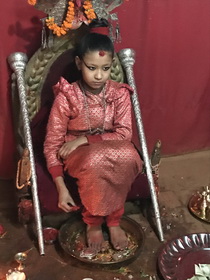 尼泊尔女神的历史源自16世纪马拉王朝。几百年来,尼泊尔人对女神的崇拜都很虔诚,他们相信,作为智慧和力量的化身,女神可以给他们带来和平与繁荣。据介绍,挑选女神,有严格的标准,包括出身必须源于释迦家族,祖辈必须生息在尼泊尔的巴格马蒂河与威斯奴蒂河这两条圣河边,星座必须与国王一样,且具备32种美德,没有瑕疵。看到幼小的孩子,整日坐在此地被人供奉,我们感觉很可惜。她如何受教育?如何玩耍?如何与人沟通?如何锻炼身体?