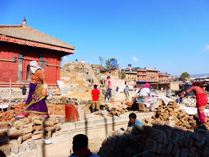 在杜巴广场旁,还有汇集众多石雕的陶马迪广场和保留众多古老粘土陶器的陶器广场。遗憾的是,在2015年大地震时,相当一部分建筑被摧毁,我们看到了大片的废墟,很多工人还在废墟上工作。我们在建于1700年的国王宫殿中,参观了国王的露天浴池。导游讲述了浴池中矗立的眼镜蛇的传说。在广场上的另一侧,我们登上了30米高的尼亚塔波拉塔庙,坐在最高层陡峭的阶梯上,俯瞰整个广场。此外,我们还抓紧时间自费参观了计划外的国家艺术博物馆(应为本土美术馆),馆内保存了尼泊尔17世纪以来王宫收藏的很多精美绘画和尼泊尔历代君主的画像。持有同一张票,本来还可以参观陶马迪广场的铜雕艺术博物馆和陶器广场的木雕艺术博物馆,因事先不知,且时间不够,未能如愿。参团最大的敝处就是,博物馆从来就不是参观的重点,因为博物馆既花时间,又要买门票。